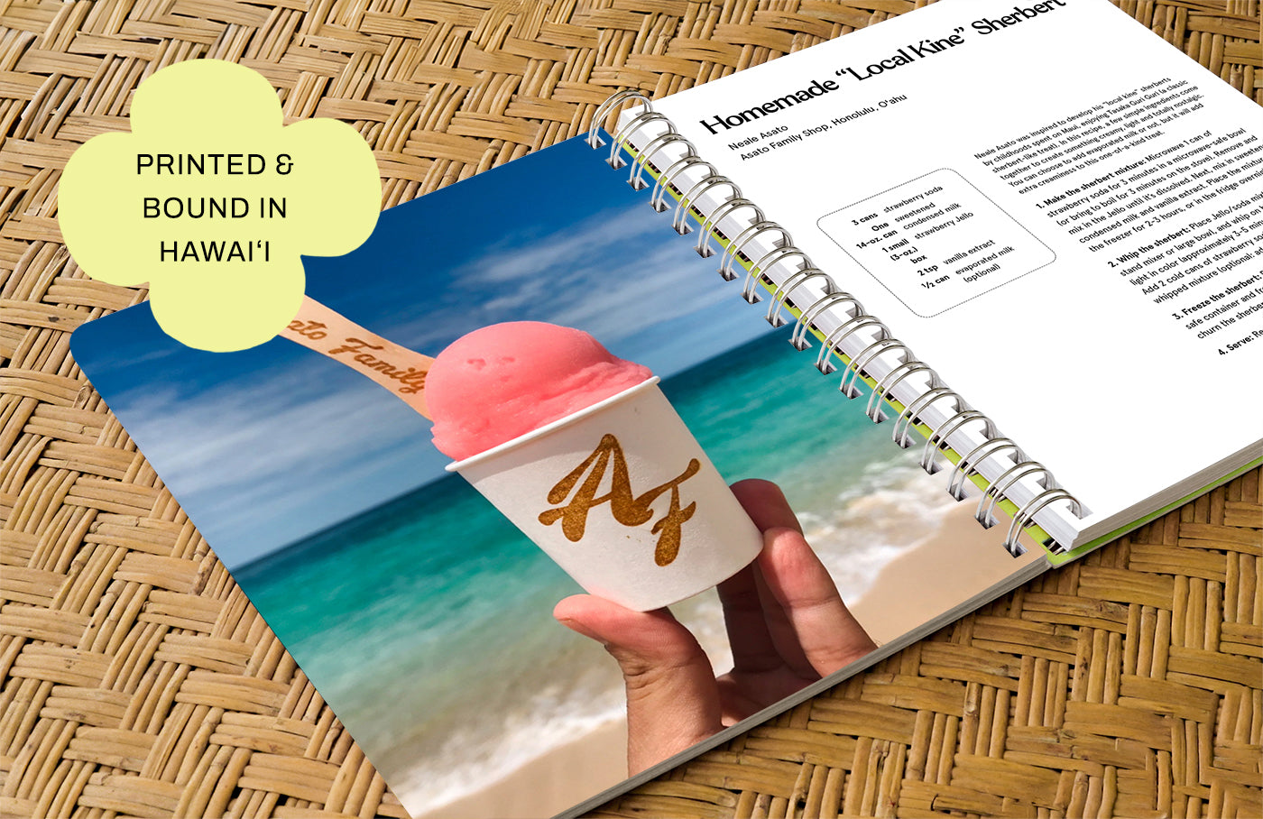 The book is spiral bound, 7.5 x 9 inches, 100 pages. The interior was printed and the book was bound in Hawaiʻi.